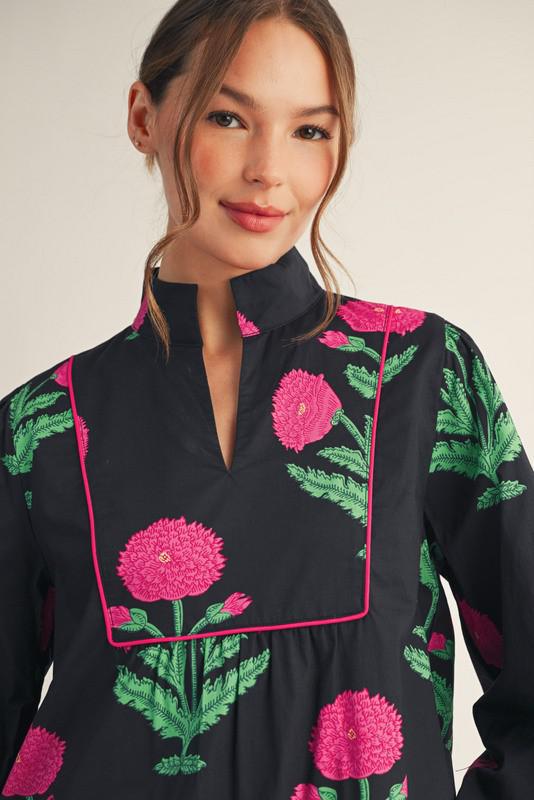 This midi dress features long sleeves and a standing neckline, adorned with a floral pattern and finished with a ruffle hem. Made from 100% cotton, it ensures comfortable wear throughout the day.