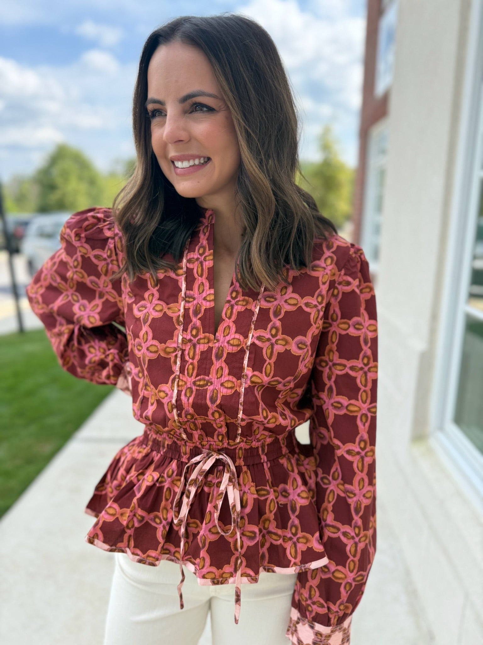 This poplin blouse features a unique flower chain-link checkered print with vibrant cherry, mustard, and coral color blocks on the hem, bodice, and tie. It offers a split V neckline, shirred shoulders, long sleeves with cuffs, and a cinched waist with stretch smocking at the back and tie detail for a flattering fit. Made from 98% cotton and 2% spandex, it combines comfort with style.