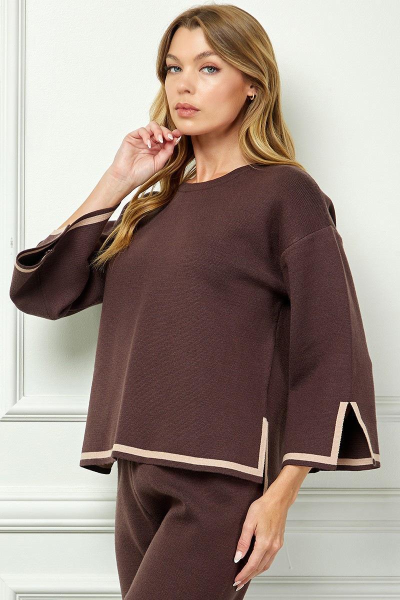 A cozy knit top designed with a relaxed silhouette and wide, three-quarter sleeves. Contrast trim highlights the hem and sleeve slits for a subtle, elevated touch. Soft, flexible, and effortlessly chic-perfect for pairing with matching bottoms or styling as an everyday modern lounge piece.