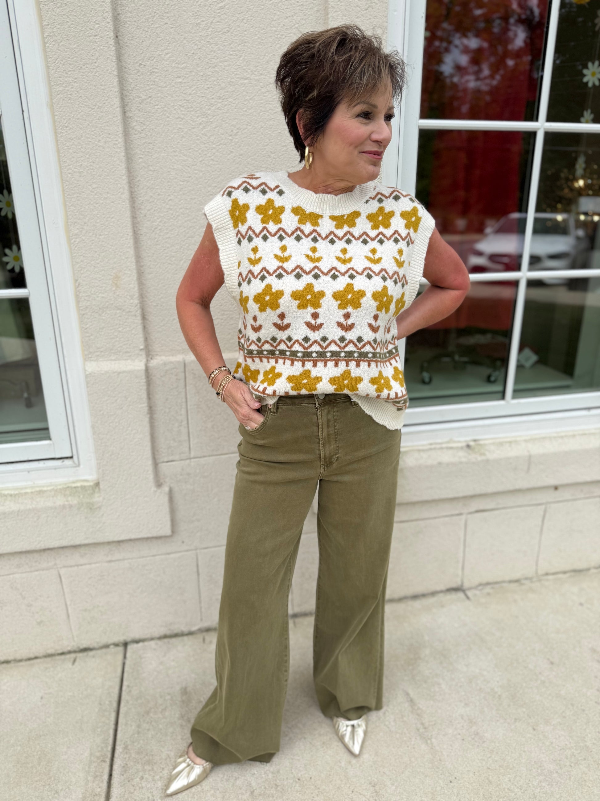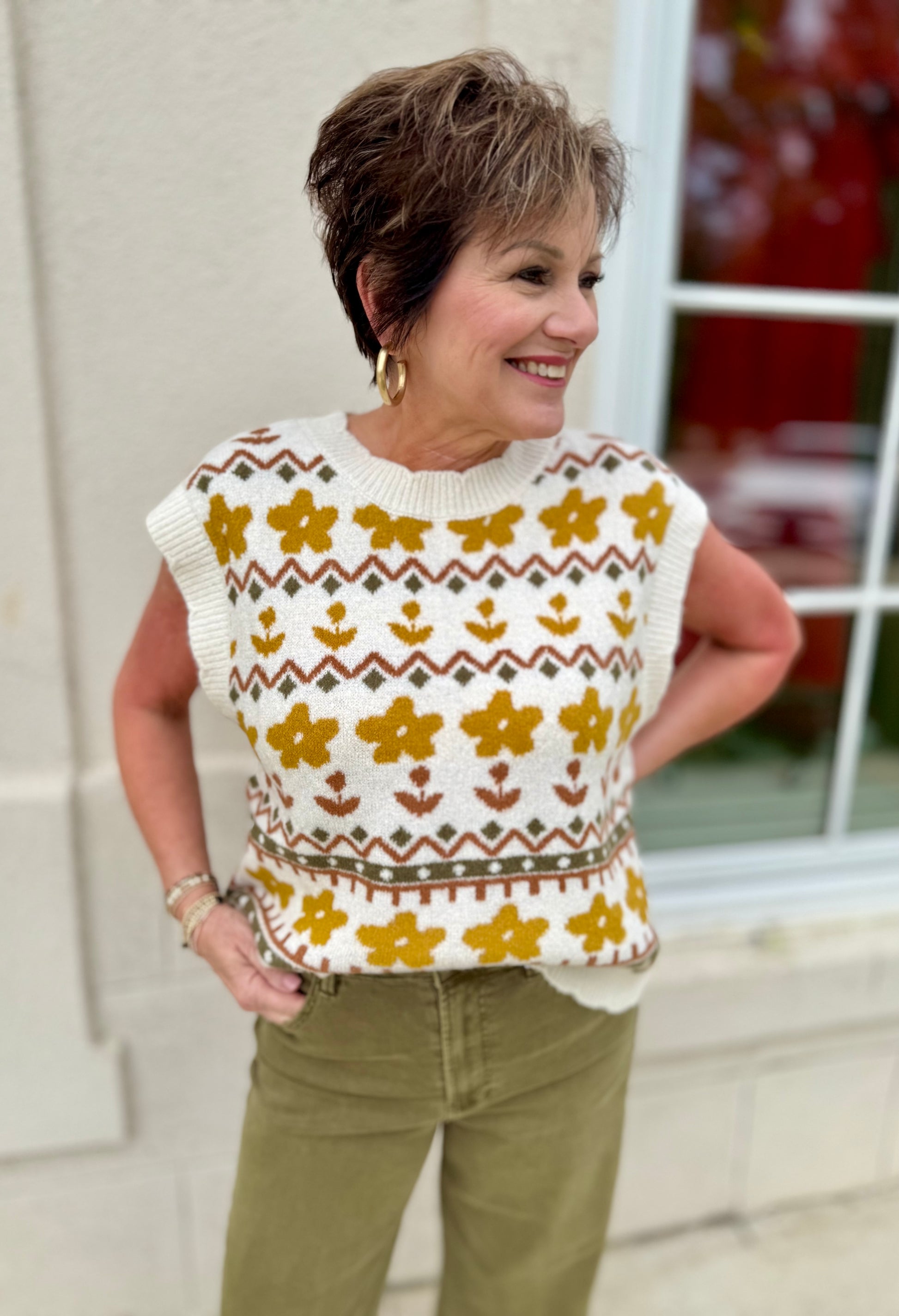 This sleeveless knit vest features a retro floral and geometric design with a crew neck and ribbed trim. The edges are finished with a soft scalloped ribbed detail. Made from a blend of 75% acrylic, 22% nylon, and 3% spandex, the vest is unlined for a lightweight feel.