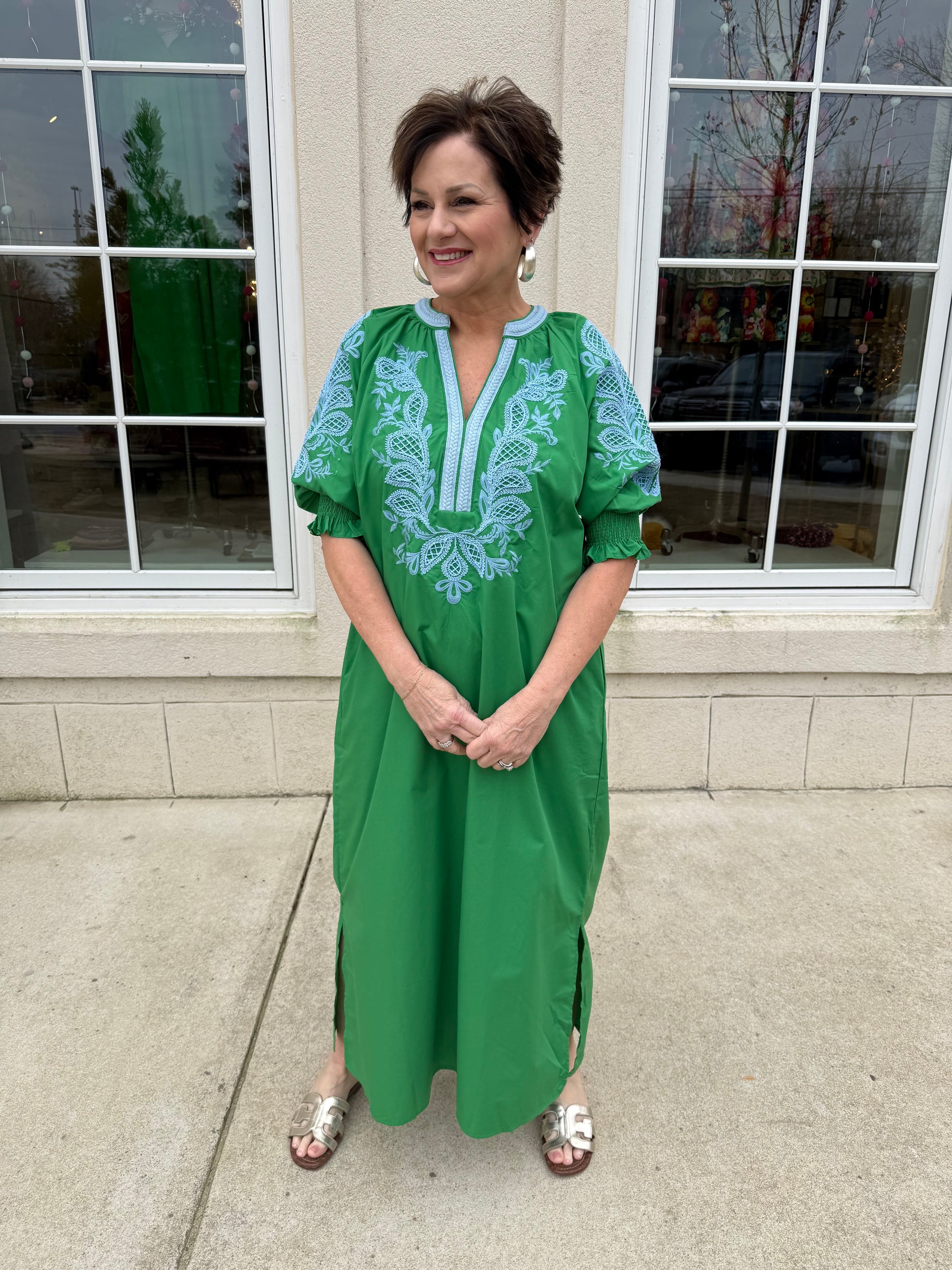 Embroidered V-neck half sleeve midi dress featuring contrast trim at neckline and sleeve. Side slits at hem. Side pockets. Lined. Woven. Non-sheer. Lightweight.