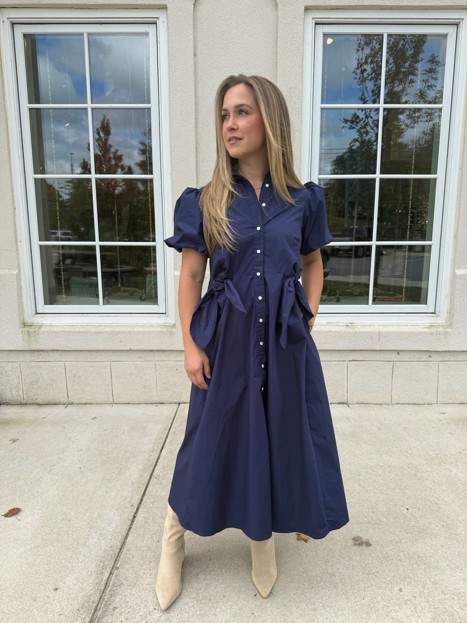 This button-down midi dress combines tailored structure with feminine details. Featuring short puff sleeves, a classic shirt collar, and flattering waist ties on both sides, it creates a defined silhouette with effortless charm. A versatile piece perfect for both casual days and dressed-up occasions in any boutique collection.