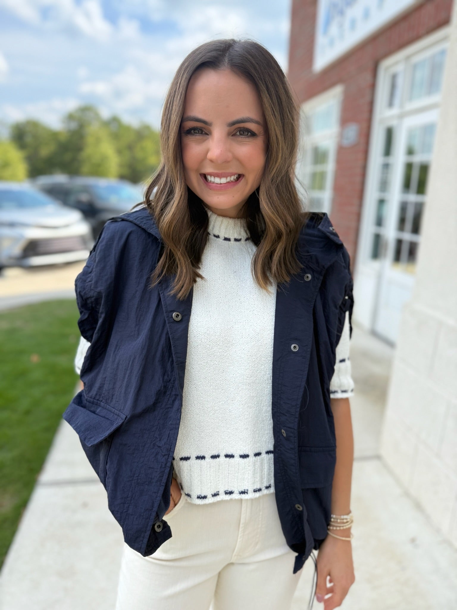 This navy vest features an adjustable drawstring hem and snap button front closure for a customizable fit. It includes pockets for convenience and subtle ruffle trim on the shoulders for a touch of style. The vest is fully lined and made from 100% nylon for lightweight comfort.