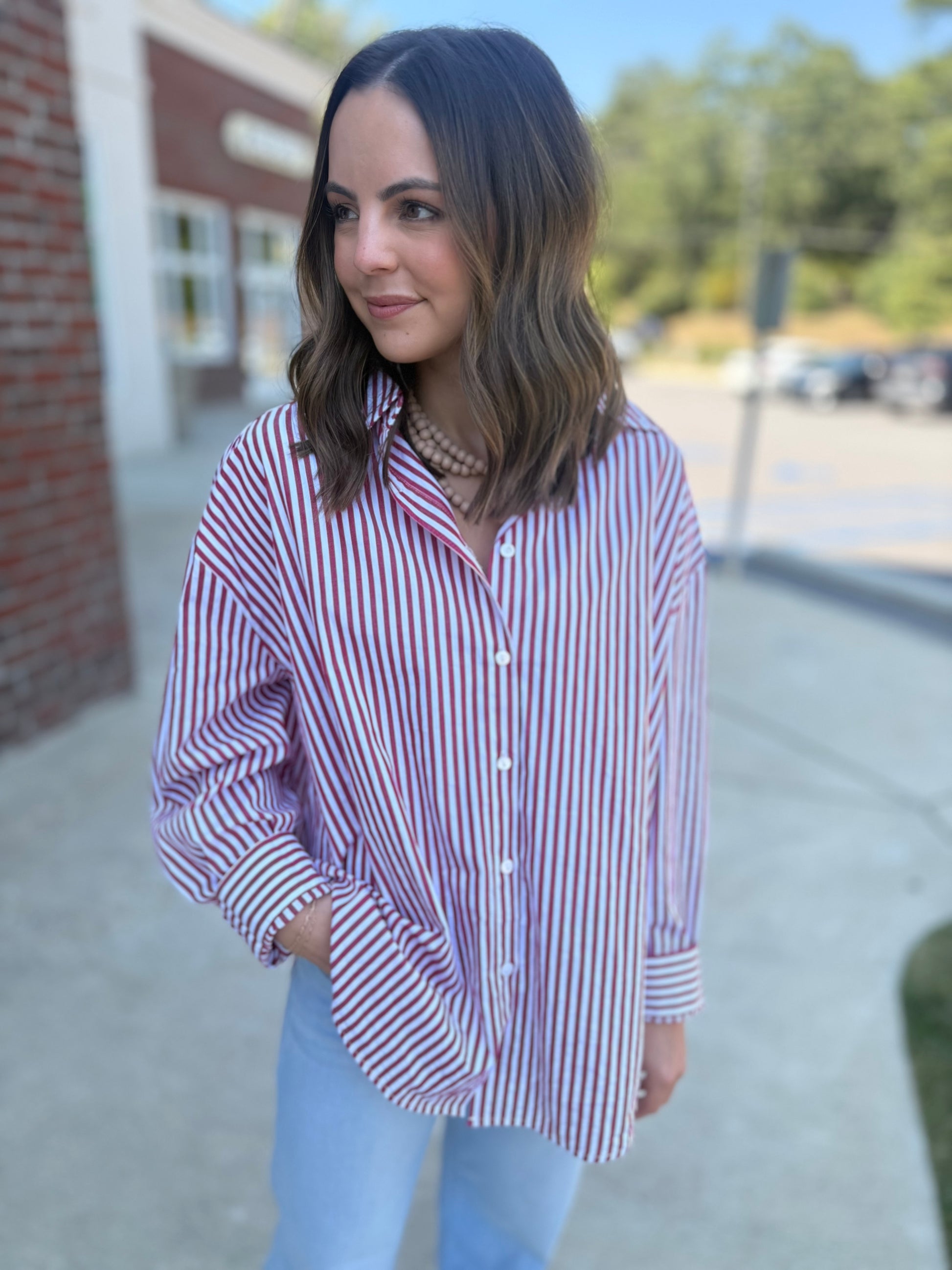 Our Demi Top features front button down closure and a bengal stripe.