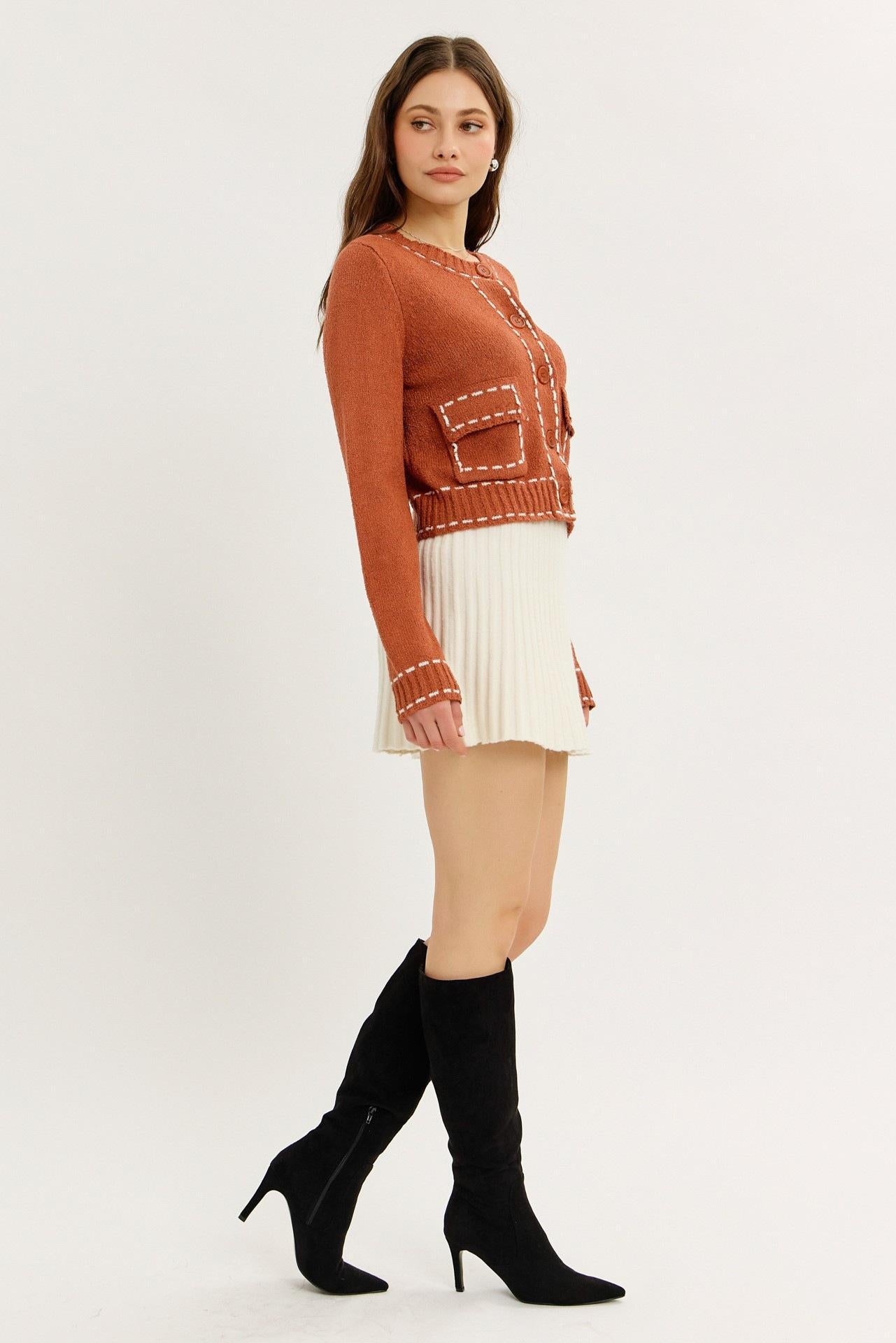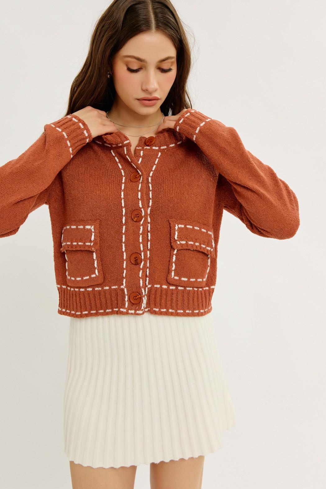This rust-colored cardigan features a textured knit design with contrast stitch accents. It has a button-down front, round neckline, long sleeves, and side patch pockets. The cropped fit and soft acrylic blend make it a stylish and cozy layering option for fall and winter. Made from 65% acrylic and 35% nylon for comfortable wear.
