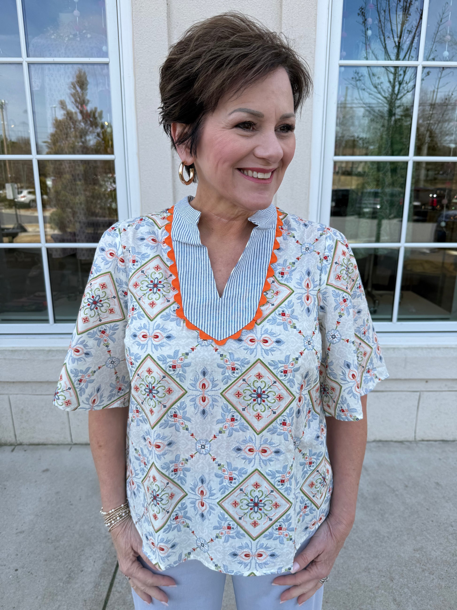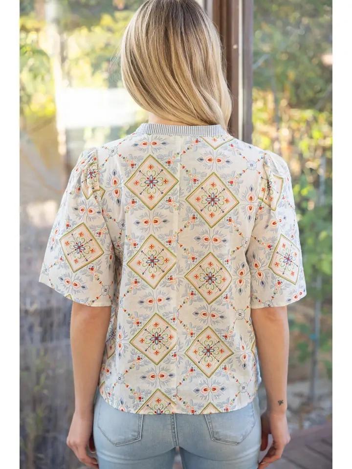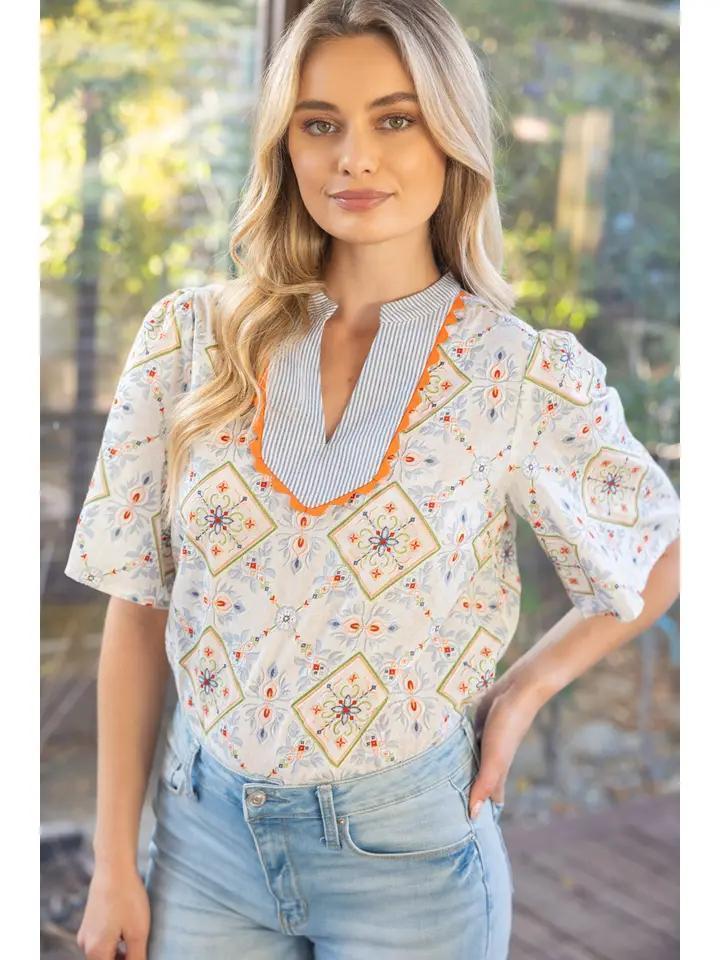 This short sleeve top features a vibrant geometric floral print with a contrast striped V-neckline and orange trim. Lightweight and easy to wear, it pairs effortlessly with denim for a fresh everyday look