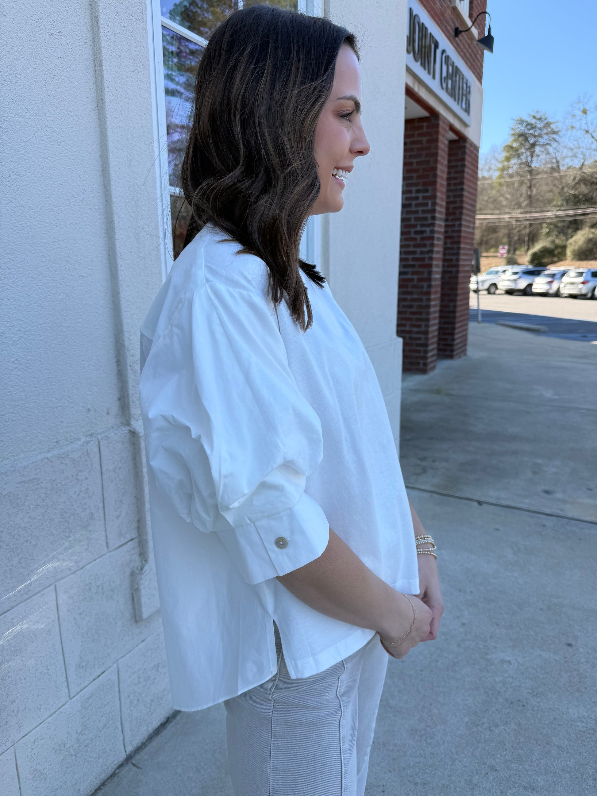 Discover effortless sophistication with this innovative mixed media top that combines the best of both worlds. The soft knit front pairs beautifully with a crisp woven back, creating visual interest and dynamic texture. Designed with a classic crew neck and charming balloon sleeves, it offers a flattering silhouette that feels both modern and timeless. Practical side slits provide ease of movement and comfort throughout your day. Crafted from 100% cotton, this versatile piece is breathable and gentle on skin—simply hand wash to maintain its quality. Perfect for layering or wearing solo, it's the go-to top for effortless style.
